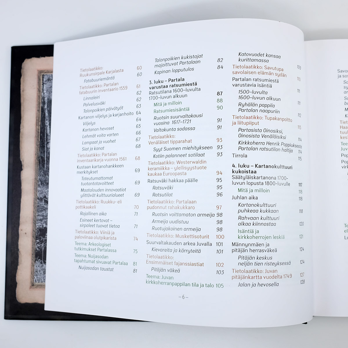 Juvan Partala on kirja eteläsavolaisen kartanon elämästä Männynmäen harjanteella, rautakaudelta nykyaikaan. Sijainti Suuren Savontien varrella on muovannut kartanon historiasta kiehtovan yhdistelmän vahvaa paikallista kansankulttuuria ja kansainvälisiä vaikutteita.Samat teemat ovat mukana koko matkan menneisyydestä nykypäivää kohti. Partalan kehityskaari kulkee kaskiruista viljelevästä talonpoikaistilasta kuninkaankartanoksi, ja säätyläissuvun omistuksesta kulttuurielämyksiä tuottavaksi matkailutilaksi.