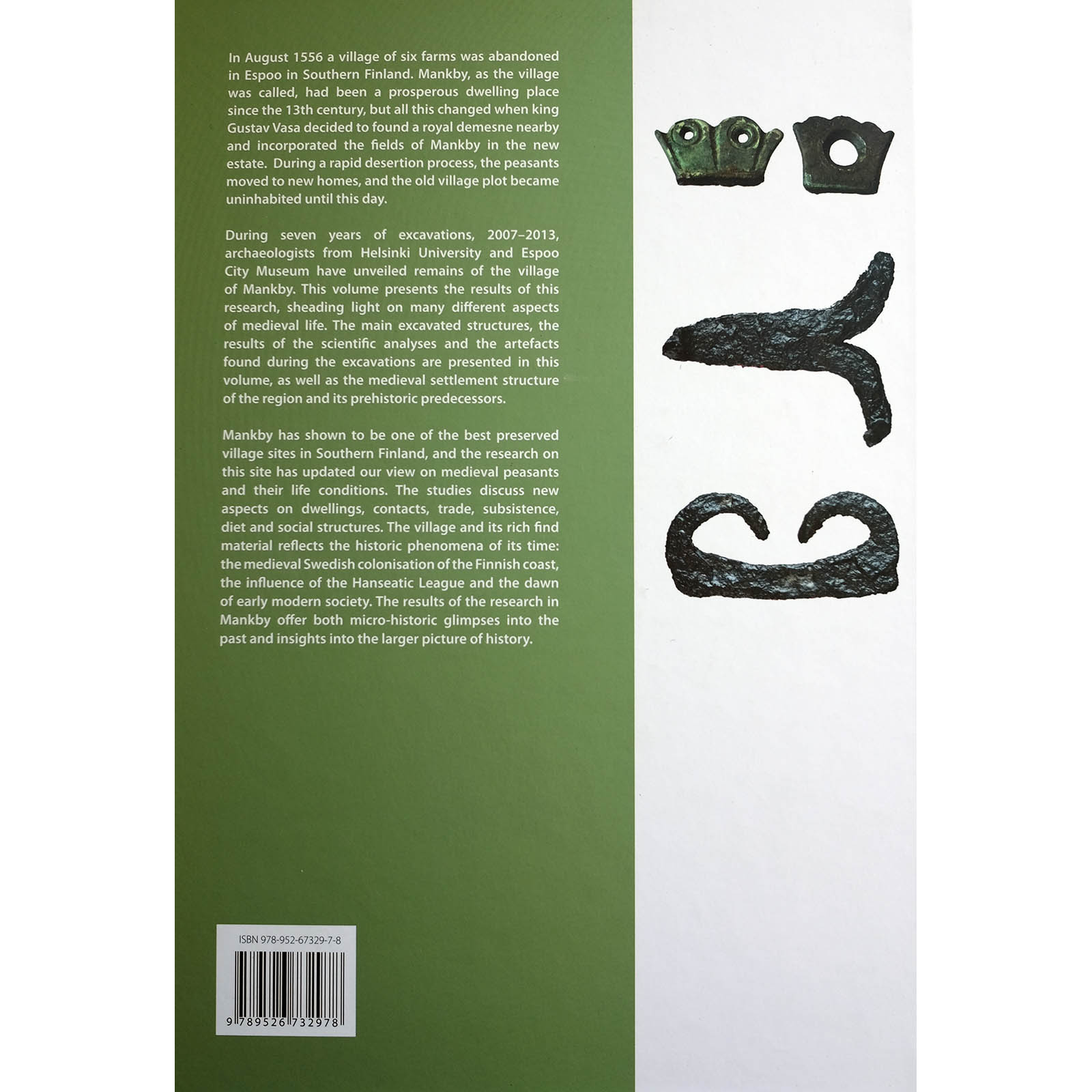 In August 1556 a village of six farms was abandoned in Espoo in Southern Finland. Mankby, as the village was called, had been a prosperous dwelling place since the 13th century, but all this changed when king Gustav Vasa decided to found a royal demesne nearby and incorporated the fields of Mankby in the new estate. During a rapid desertion process, the peasants moved to new homes, and the old village plot became uninhabited until this day. During seven years of excavations, 2007–2013, archaeologists from Helsinki University and Espoo City Museum have unveiled remains of the village of Mankby. Mankby. A Deserted Medieval Village on the Coast of Southern Finland presents the results of this research, shedding light on many different aspects of medieval life. The main excavated structures, the results of the scientific analyses and the artefacts found during the excavations are presented in this volume, as well as the medieval settlement structure of the region and its prehistoric predecessors. Mankby has shown to be one of the best preserved village sites in Southern Finland, and the research on this site has updated our view on medieval peasants and their life conditions. The studies discuss new aspects on dwellings, contacts, trade, subsistence, diet and social structures. The village and its rich find material reflects the historic phenomena of its time: the medieval Swedish colonisation of the Finnish coast, the influence of the Hanseatic League and the dawn of early modern society. The results of the research in Mankby offer both micro-historic glimpses into the past and insights into the larger picture of history.