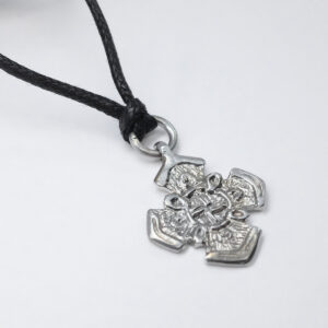 Risti on pakattu tummaan korurasiaan (koko 6,5 x 6,5 x 2,5 cm).
