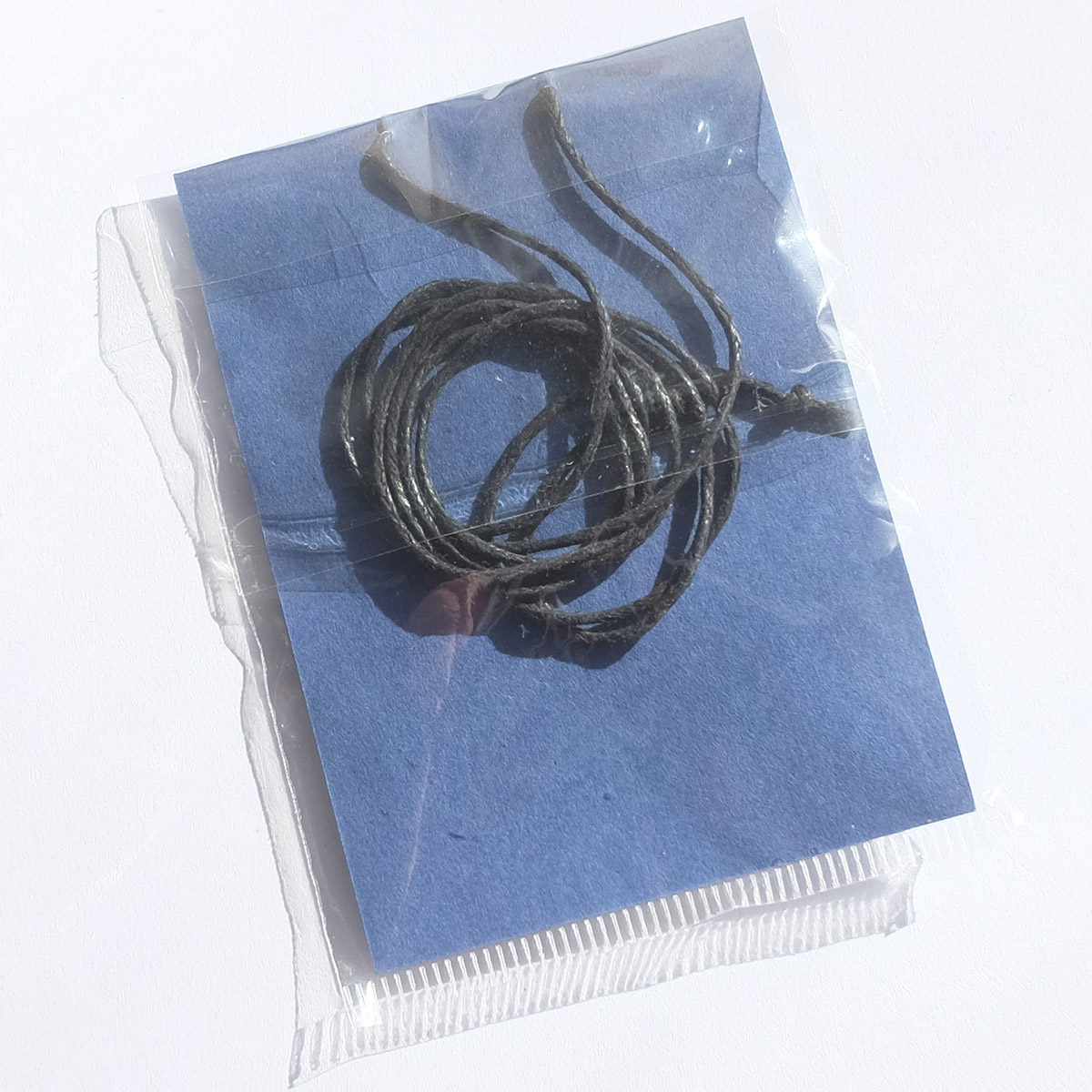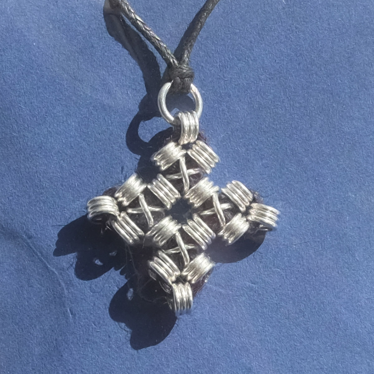 Koristespiraalit (paksuus 0,8 mm) 925 hopeaa ja lanka 100 % villaa. Koristeen koko 2,5 x 2,5 cm + ripustuslenkki. Nauha mustaa vahattua puuvillalankaa. Spiraalit kiinnitetty toisiinsa tummansinisellä villalangalla (saatavana myös punaisella villalangalla).