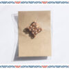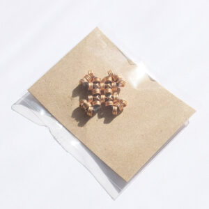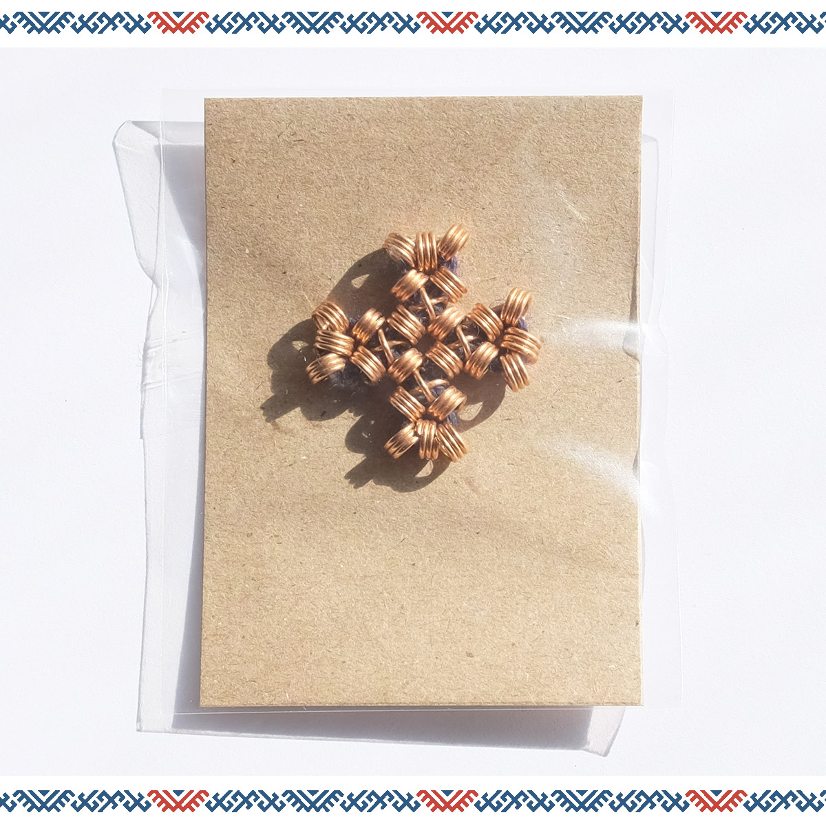 Koristespiraalit (paksuus 0,8 mm) 8 % tinapronssia ja lanka 100 % villaa. Koristeen koko noin 2,8 x 2,8 cm. Spiraalikoriste on koottu yhdellä kaksinkertaisella langalla pujottamalla.