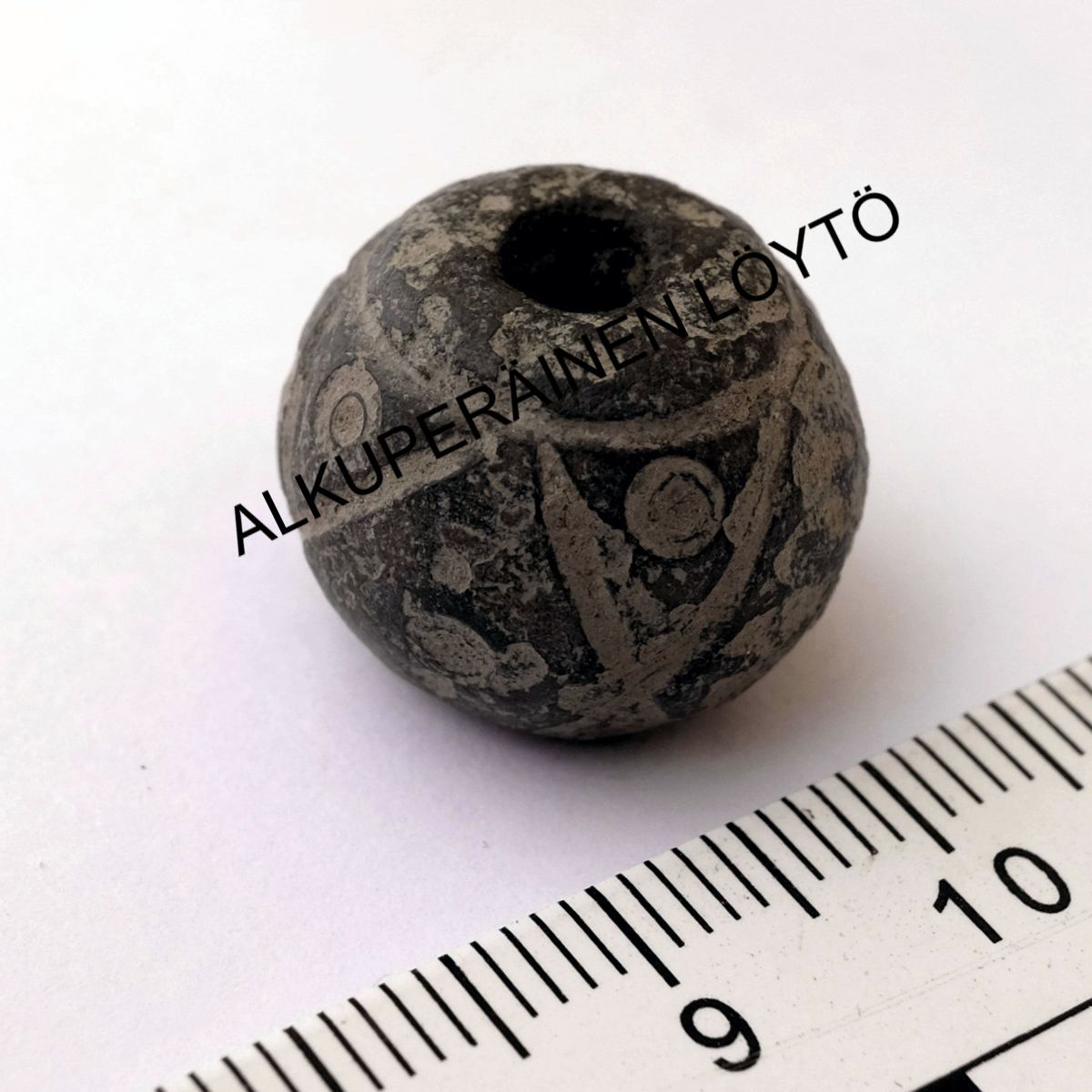 Helmi on koristelun yksityiskohdiltaan ainutlaatuinen, eikä toista vastaavaa tunneta. Helmen koristelu koostuu kolmesta X:n muotoisesta kuviosta. Vinosti toisiaan leikkaavat viivat muodostavat vinoristin kaltaisen muodon, jonka molempien haarojen sisällä on rengaskuvio, ns. häränsilmä. Suomen rautakautiseen koristelulle tyypilliset häränsilmäkuviot löytyvät myös ristikuvioiden välissä. Helmen ylä- ja alareunaa kiertää lisäksi kehäpainanne.