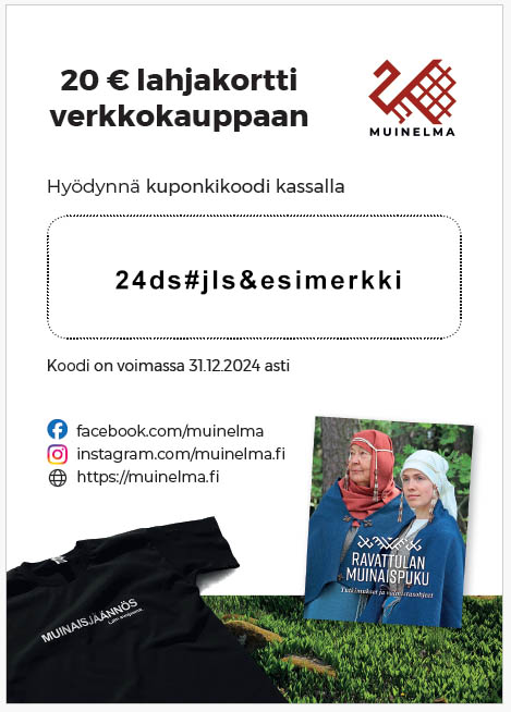 20 € lahjakortti Muinelman verkkokauppaan Hyödynnä kuponkikoodi kassalla. Lahjakortti on kertakäyttöinen.